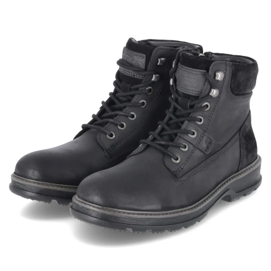 Für verlässliche Wärme und Stabilität in der kalten Jahreszeit steht dieser Winterboot aus schwarzem Leder von Camel Active. Das dichte Warmfutter, die textil bezogene Decksohle und die gepolsterte Einstiegszone sorgen für ein komfortables Innenleben. Schnürsenkel erlauben eine exakte Anpassung an den Fuß, während der praktische Reißverschluss den schnellen Einstieg unterstützt; eine Anziehlasche erleichtert das Handling zusätzlich. Dank Wechselfußbett sind orthopädische Einlagen problemlos einsetzbar. Die runde Schuhspitze bietet natürlichen Spielraum, die flexible, rutschfeste Sohle gibt Halt auf glatten Untergründen, und der verstärkte Fersenbereich erhöht die Langlebigkeit. Das klare, klassische Design passt zu zahlreichen Outfits und fällt normal aus. Modetipp: Mit Thermojeans, Strickrolli und einem rustikalen Kurzmantel entsteht ein warmer, urbaner Winterlook.