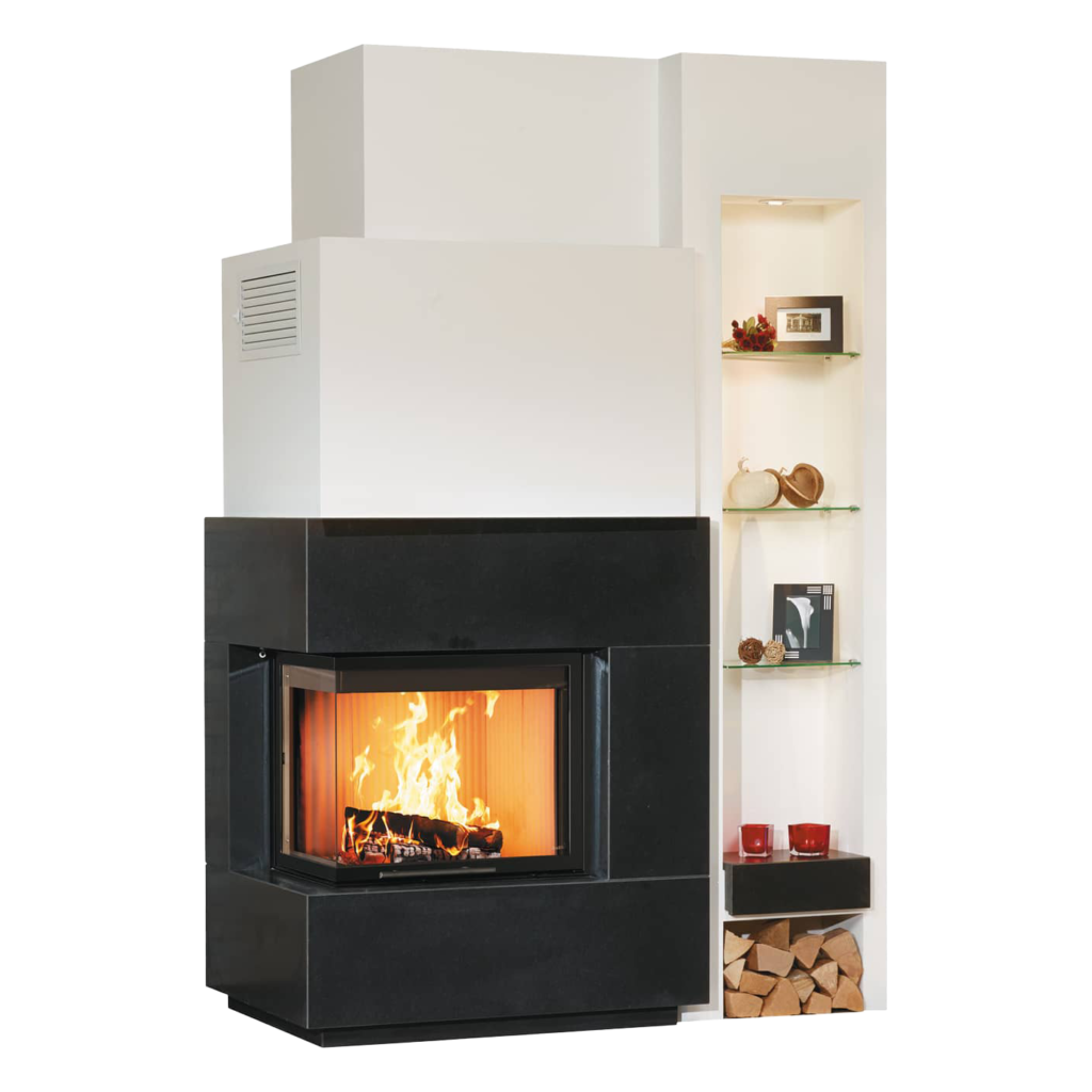 Unser Marmorkamin 1/136.0 WW verleiht dem Kaminfeuer einen besonders edlen Rahmen. Um den modernen Heizeinsatz mit zweiseitiger Sichtscheibe ist er grossflaechig mit satiniertem Nero-Assoluto-Marmor verkleidet. Daneben sticht das integrierte Regal mit Glasböden und optionaler Beleuchtung ins Auge. Es bietet Platz faer Dekorationen und Brennholz.