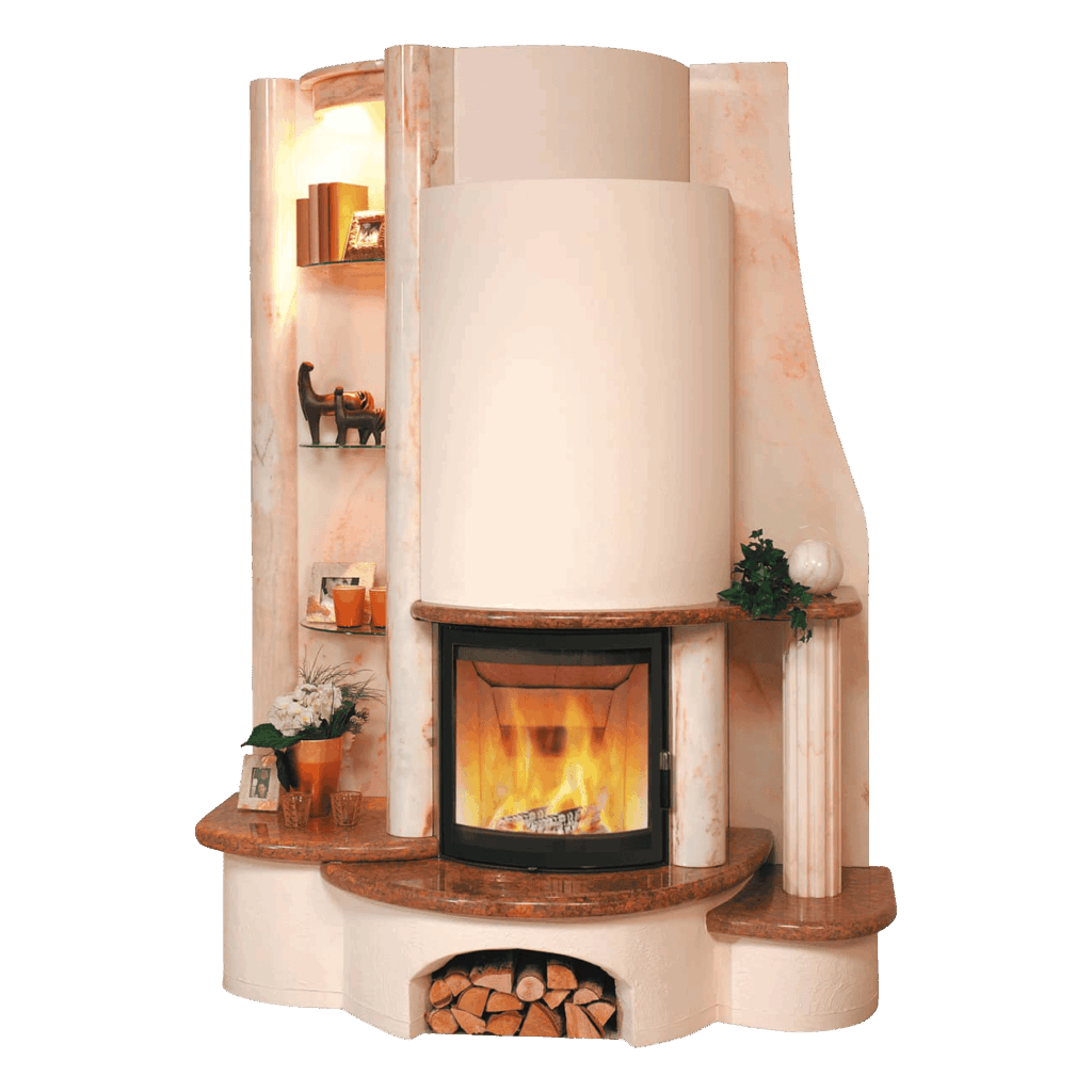 Der HARK Marmorkamin 1/63.0 faellt durch seine weich-gerundeten Formen und die Elemente aus poliertem Estremoz-Marmor ins Auge. Das integrierte Regal mit Glasböden und Beleuchtung bietet Platz faer Dekorationen. In dem im Sockel integrierten Holzfach lagert das Brennholz immer griffbereit.