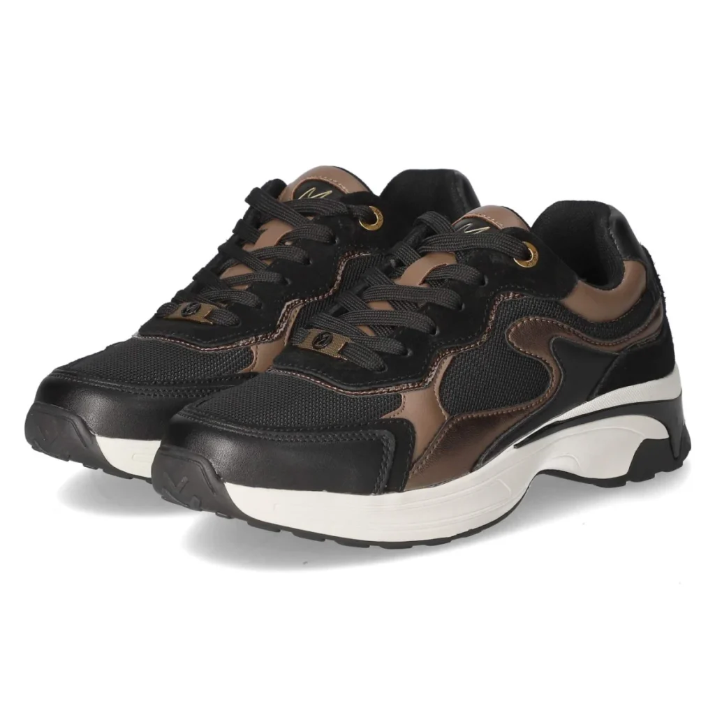 Mit PORTIA LOVE gelingt Mexx ein Low Sneaker, der dezentes Understatement und glänzende Details balanciert. Schwarzes Obermaterial aus Textil und Synthetik trifft auf Mesh-Einsätze, die dem Schuh Struktur und Luftigkeit geben. Goldfarbene Logos und metallisch schimmernde Elemente akzentuieren das Design, ohne aufdringlich zu wirken. Der gepolsterte Einstieg und das softe Fußbett sorgen für Komfort bei langen Tagen, die runde Front und die flexible, rutschfeste Laufsohle komplettieren das angenehme Trageerlebnis. Per Schnürung lässt sich die Passform exakt anpassen, gleichzeitig fällt das Modell regulär aus; die textile Decksohle unterstützt ein bequemes Klima. Ob casual oder smart-casual – dieser Sneaker fügt sich souverän ein. Modetipp: Mit dunkelgrauem Anzug aus feiner Wolle und einem schlichten schwarzen Top entsteht ein moderner Office-Look, der durch goldene Accessoires elegant abgerundet wird.