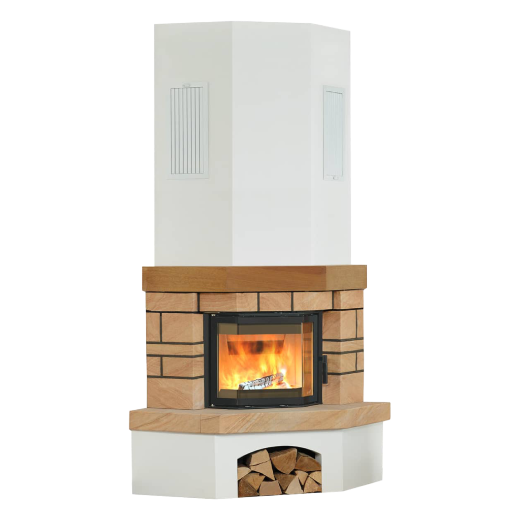 Der HARK Natursteinkamin 4/1.5 ist grosszaegig mit Sandstein verkleidet, wobei der geschliffene Untersims stimmig mit bossierten Flaechen zusammenspielt. Abgerundet wird die Optik durch den Obersims aus gemasertem Kambala-Holz. Im Sockel ist ein grosses Fach faer Brennholz integriert, das so immer griffbereit lagert.
