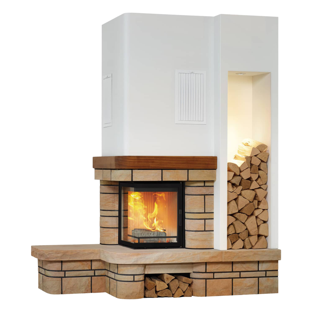 Der HARK Natursteinkamin 4/13.0 ist grosszaegig mit Sandstein verkleidet, wobei der geschliffene Untersims stimmig mit bossierten Flaechen zusammenspielt. Abgerundet wird die Optik durch den Obersims aus gemasertem Kambala-Holz. In dem seitlich integrierten Holzfach ist das Brennholz immer griffbereit. Die optionale Beleuchtung sorgt hier faer einen zusaetzlichen Akzent.