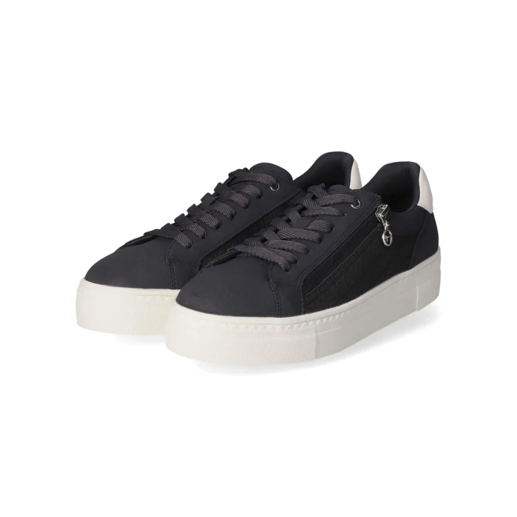 Dieser blaue Low Sneaker von Tamaris kombiniert sportliche Leichtigkeit mit detailbewusstem Design. Das Obermaterial aus Synthetik zeigt eine feine Markenmusterprägung, akzentuiert von weißen Highlights und dezenten Logos, die dem Schuh eine wertige Note verleihen. Die runde Spitze und die normal ausfallende Passform sichern angenehmen Raum, während der leicht gepolsterte Einstieg und der verstärkte Fersenbereich Komfort und Halt erhöhen. Dank der Mischung aus Schnürung und seitlichem Reißverschluss gelingt das An- und Ausziehen mühelos. Ein herausnehmbares, komfortables Wechselfußbett auf textilem Decksohlenmaterial sowie die rutschfeste Laufsohle runden das Funktionsthema ab. Das 3,5 cm Plateau schafft eine moderne Silhouette und sanfte Dämpfung. Hergestellt aus veganen Materialien ist der Sneaker ein stilsicherer Begleiter für Damen. Modetipp: mit Anzughose und crispem Weißhemd entsteht ein sportiver Tailoring-Look.