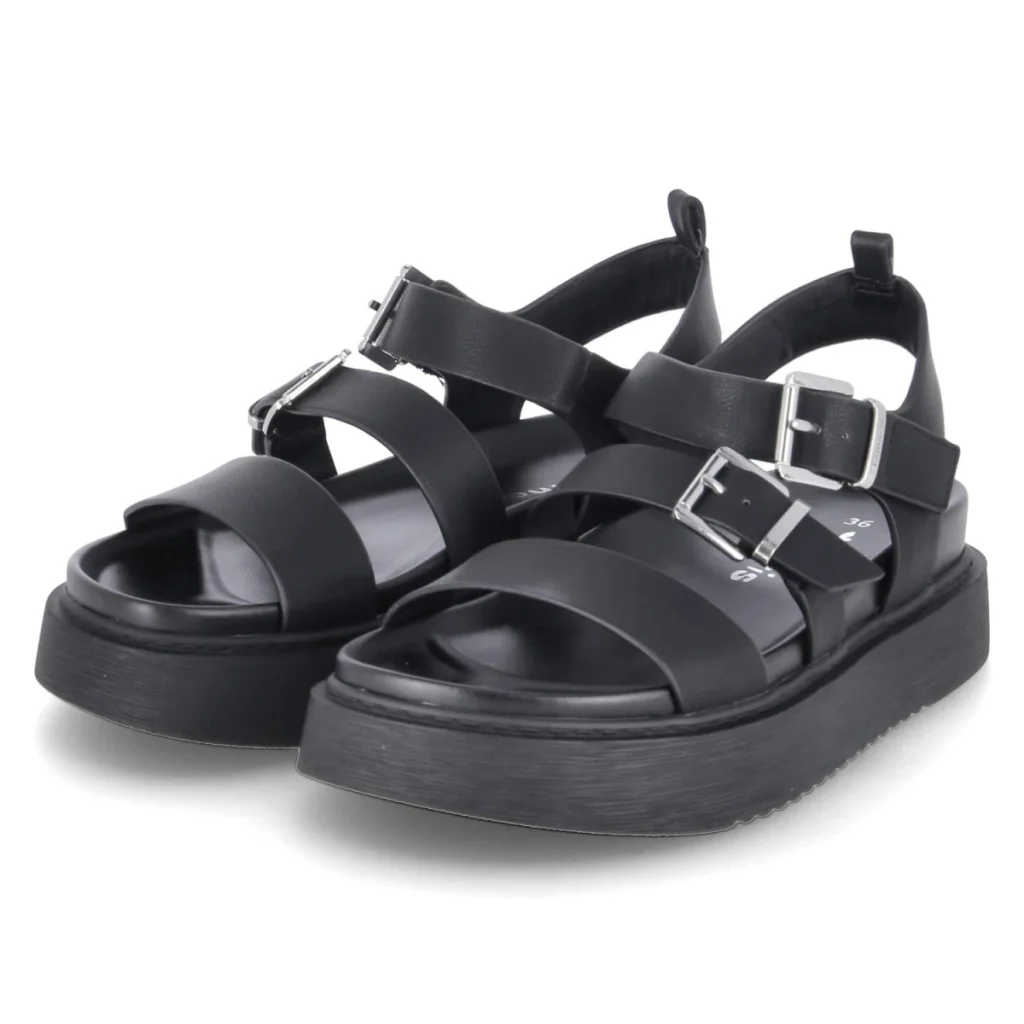 Sommerliche Leichtigkeit trifft auf funktionales Design: Diese schwarzen Römer-Sandalen von Tamaris überzeugen mit klarer Linienführung und einem komfortbetonten Aufbau. Vegane Materialien bestimmen das synthetische Obermaterial, die offene Spitze sorgt für luftiges Tragegefühl. Der vordere Riemen ist als Klettverschlussriemen mit dekorativer Schnalle und elastischem Einsatz konstruiert, der zweite Riemen schließt über eine Schnalle – für sicheren Sitz und variable Anpassung. Ein weich gepolstertes, vorgeformtes Fußbett aus Synthetik begleitet jeden Schritt, während das 4 cm hohe Plateau eine sanfte Erhöhung und stabile Basis bietet. Der bequeme Klettverschluss erleichtert das Handling, die Passform fällt normal aus. Modetipp: Besonders harmonisch zu leichten Satinslipskirts und gestrickten Tanktops; eine Mini-Schultertasche rundet das Ensemble modern ab.